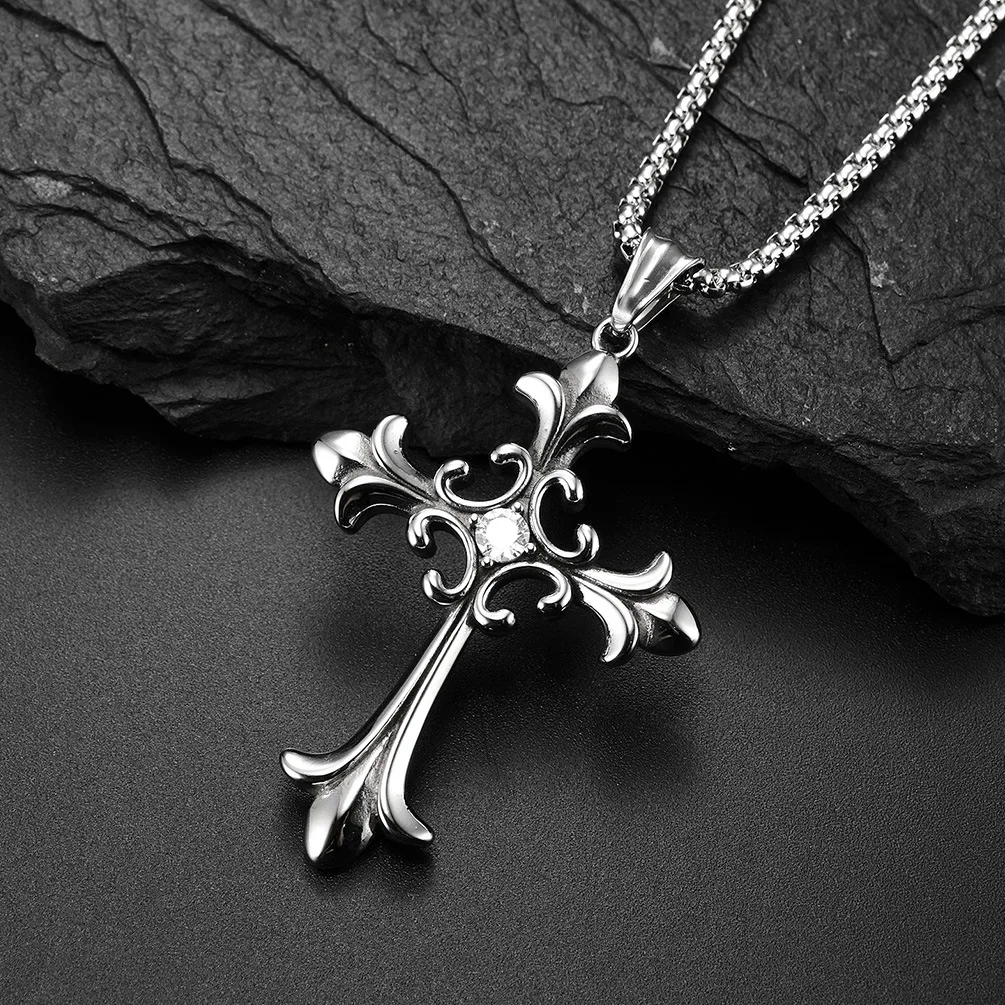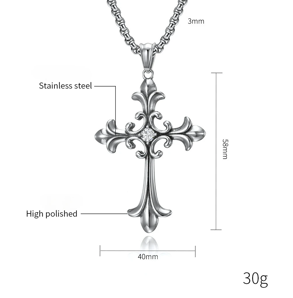 Gothic Style Retro Stainless Steel Cross Inlaid Diamond Pendant Necklace for Men's Jewelry Accessories